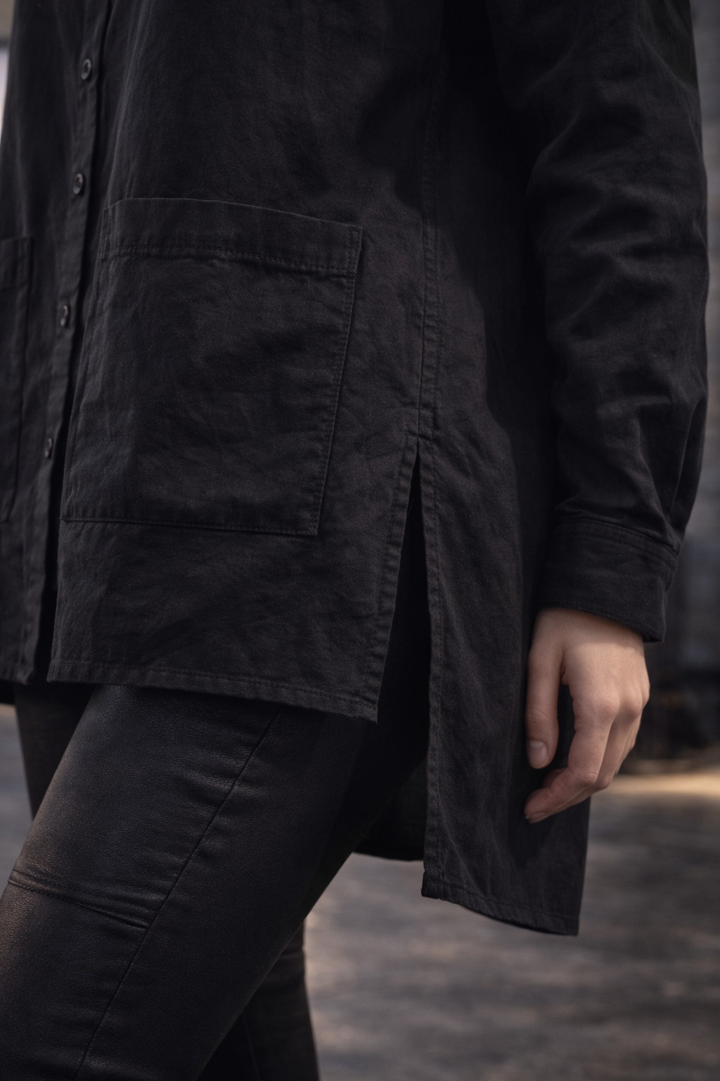 Gefertigt aus weicher, hochwertiger Baumwolle mit leicht bewegter Oberfläche, fällt sie locker und natürlich. Der entspannte Schnitt sorgt für Komfort, während durchdachte Details den Look besonders machen: Zwei aufgesetzte Taschen im Vorderteil, seitliche Schlitze und ein hinten ca. 7–8 cm längeres Rückteil verleihen der Bluse ihre moderne Silhouette.
