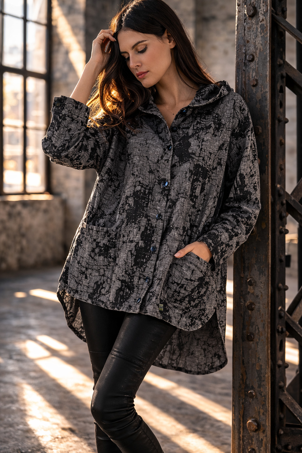 Diese besondere Bluse verbindet lässige Weite mit einer markanten Oberfläche. Die hochwertige, beschichtete Baumwolle verleiht dem Material eine bewegte, leicht strukturierte Optik und sorgt gleichzeitig für einen angenehmen Griff.