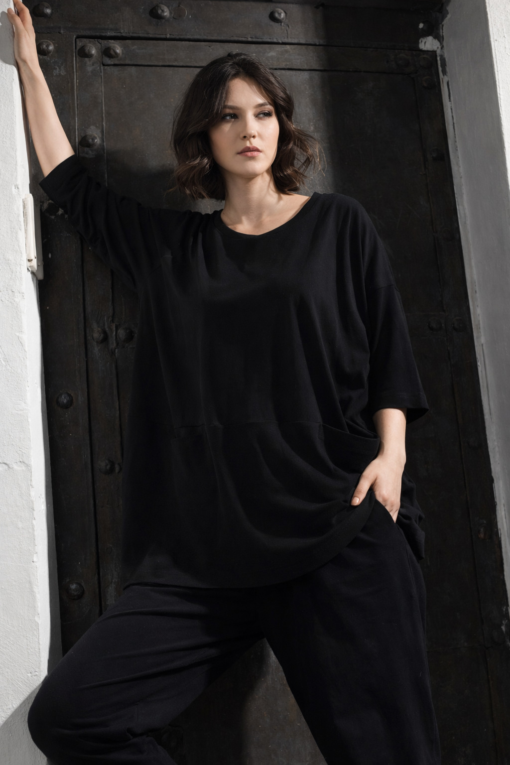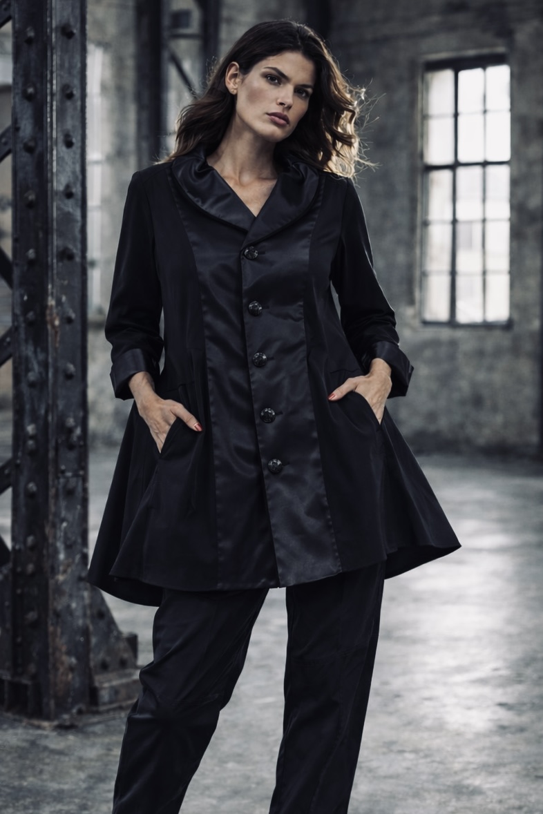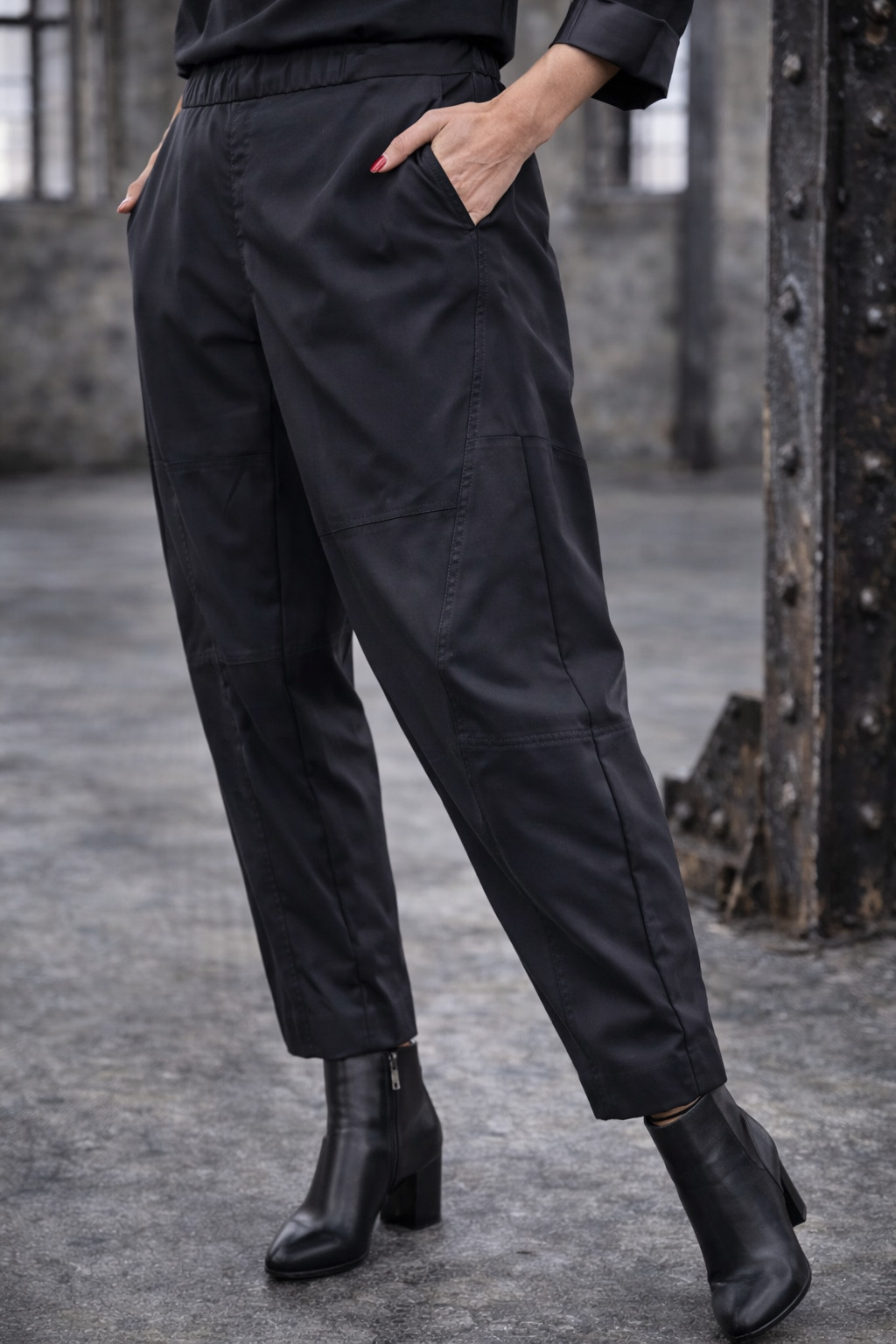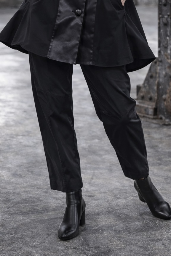 Der Schnitt ist bewusst locker gehalten, mit mit einem Rundumgummi in der Taille und Eingriffstaschen in den Seiten. So entsteht Bewegungsfreiheit, ohne an Struktur zu verlieren. Die markanten Teilungsnähte gliedern das Bein architektonisch und verleihen dem Design Tiefe und Charakter.