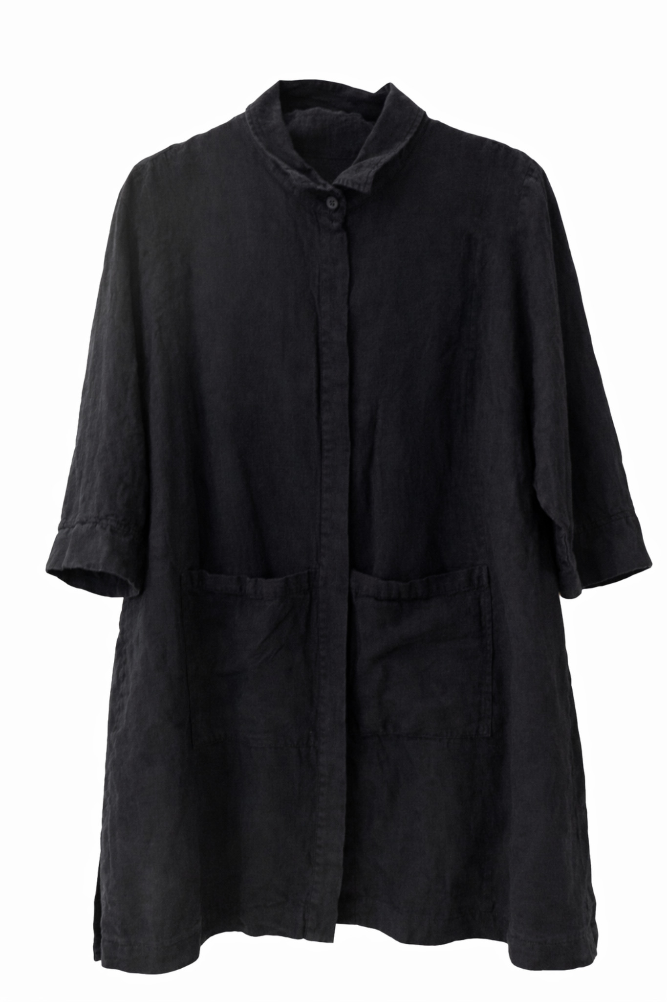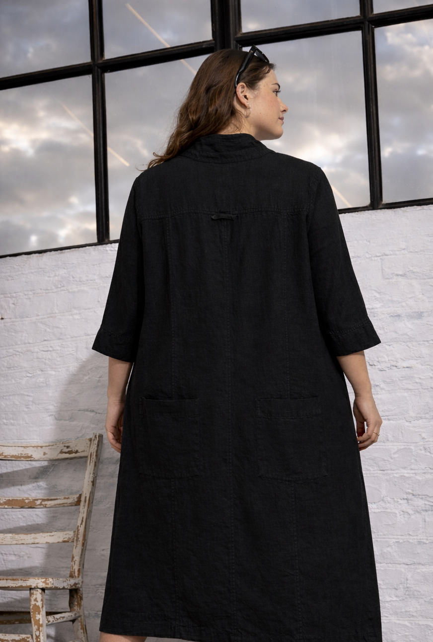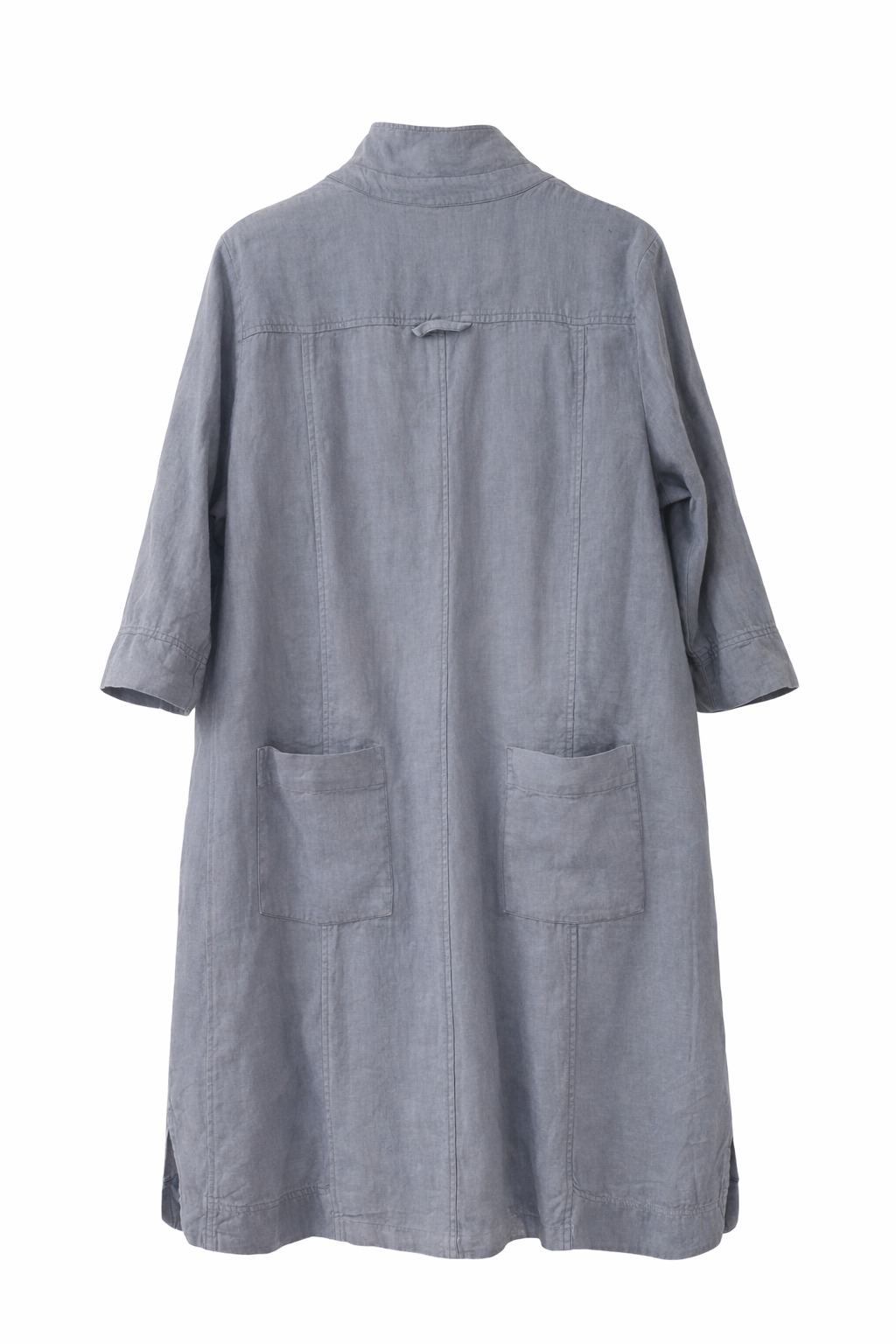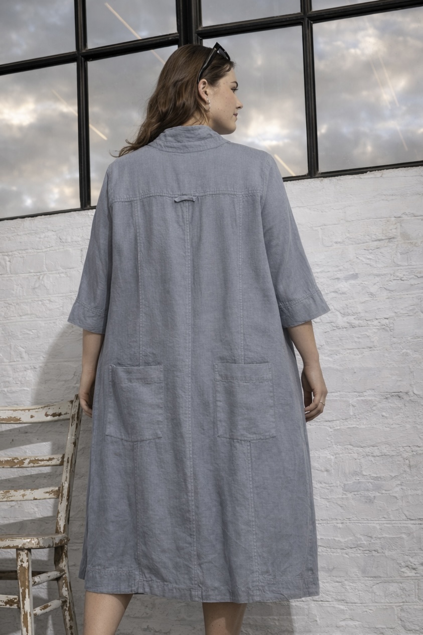 Die kniebedeckende Länge macht das Kleid vielseitig tragbar. Zwei aufgesetzte Taschen im Rücken setzen einen besonderen, dezenten Blickfang.