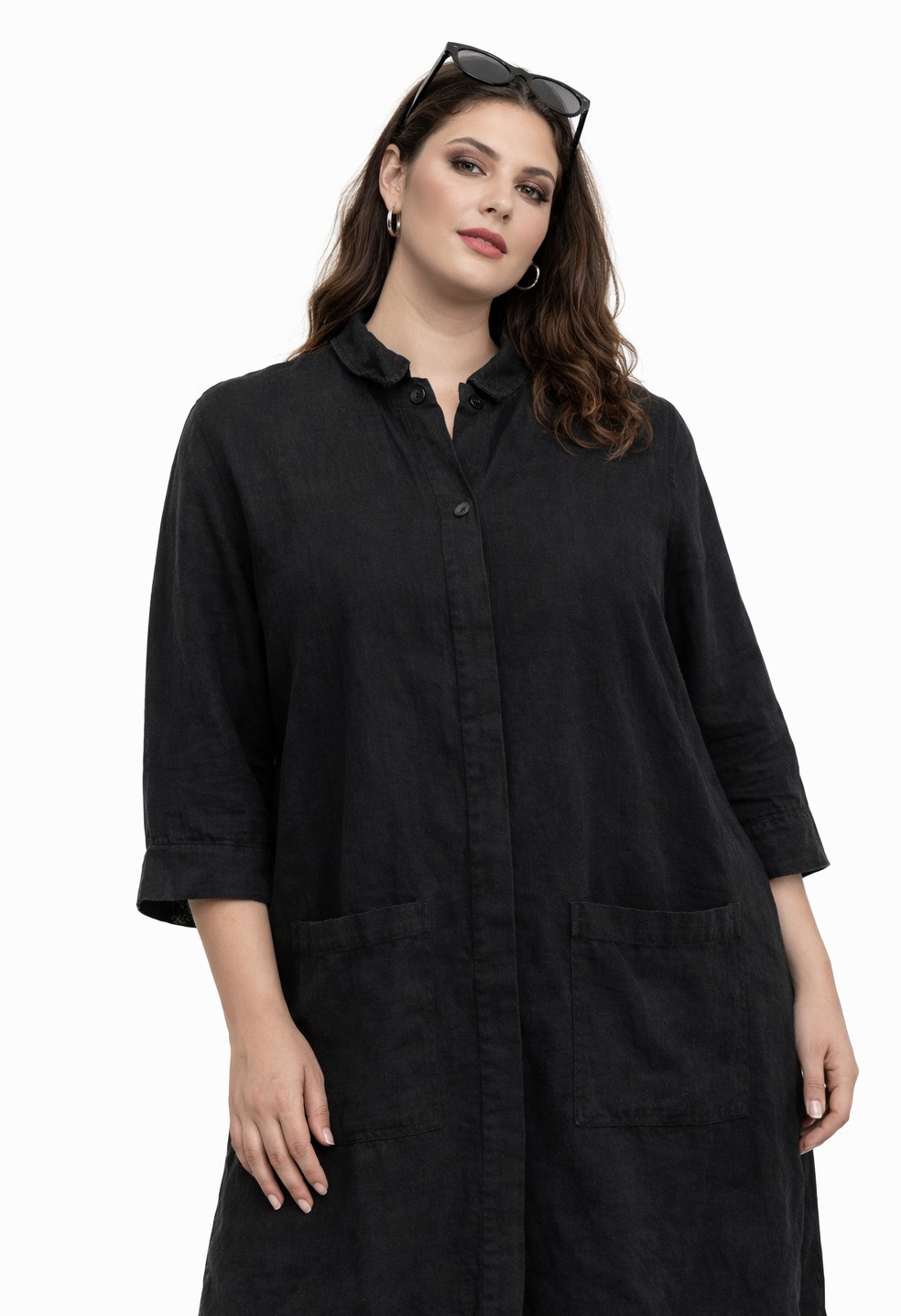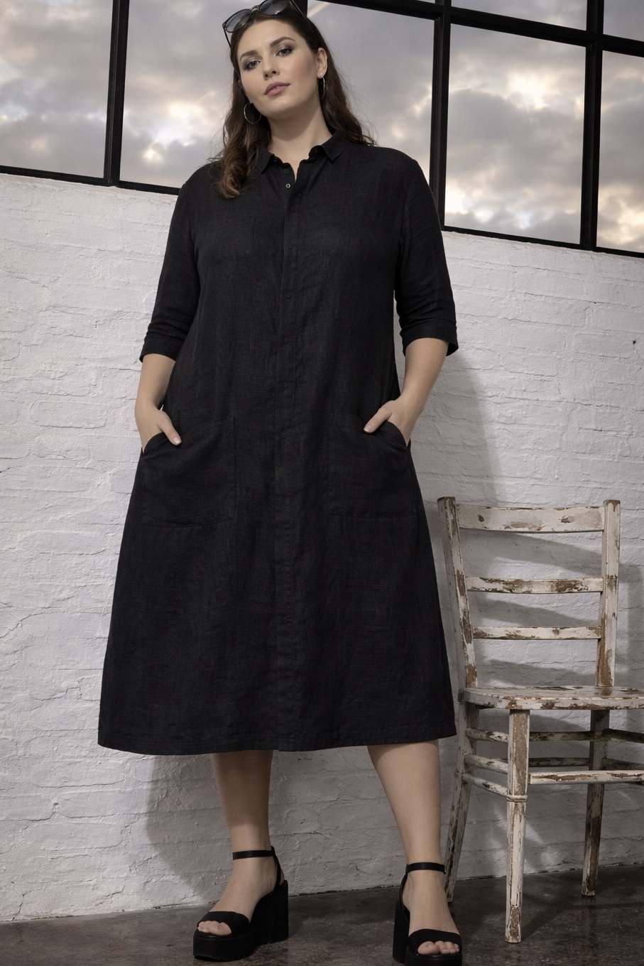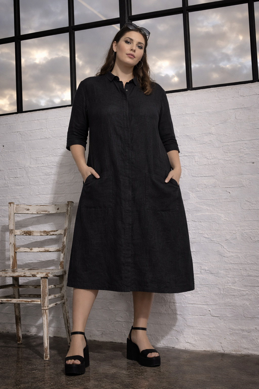 Dieses Kleid von ELLi aus hochwertigem Waschleinen überzeugt durch seine natürliche Struktur und einen modernen, puristischen Look. Der Umlegekragen und die verdeckte Knopfleiste sorgen für eine klare Optik, während die figurumspielende, leichte A-Silhouette angenehm fällt.