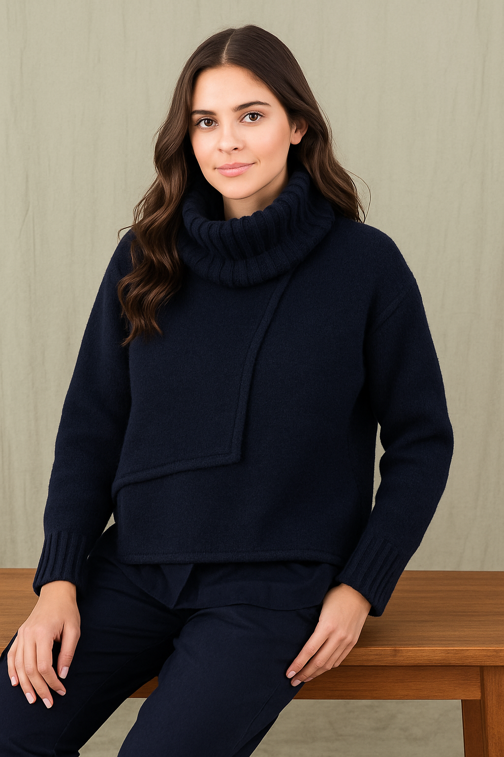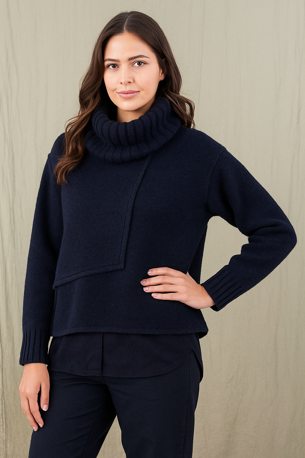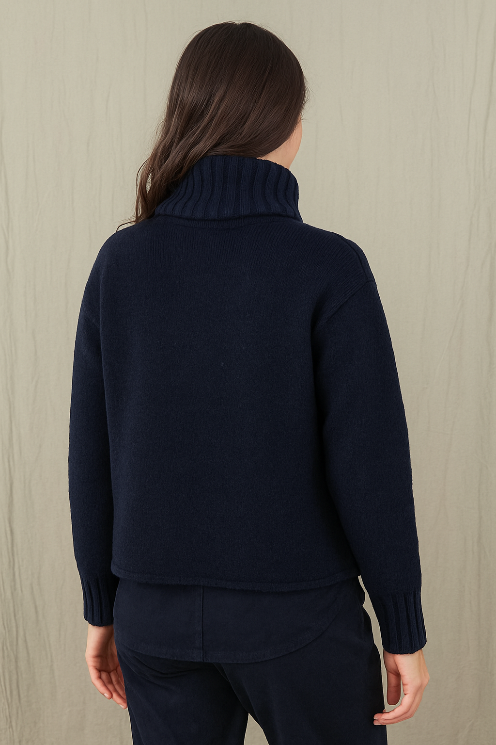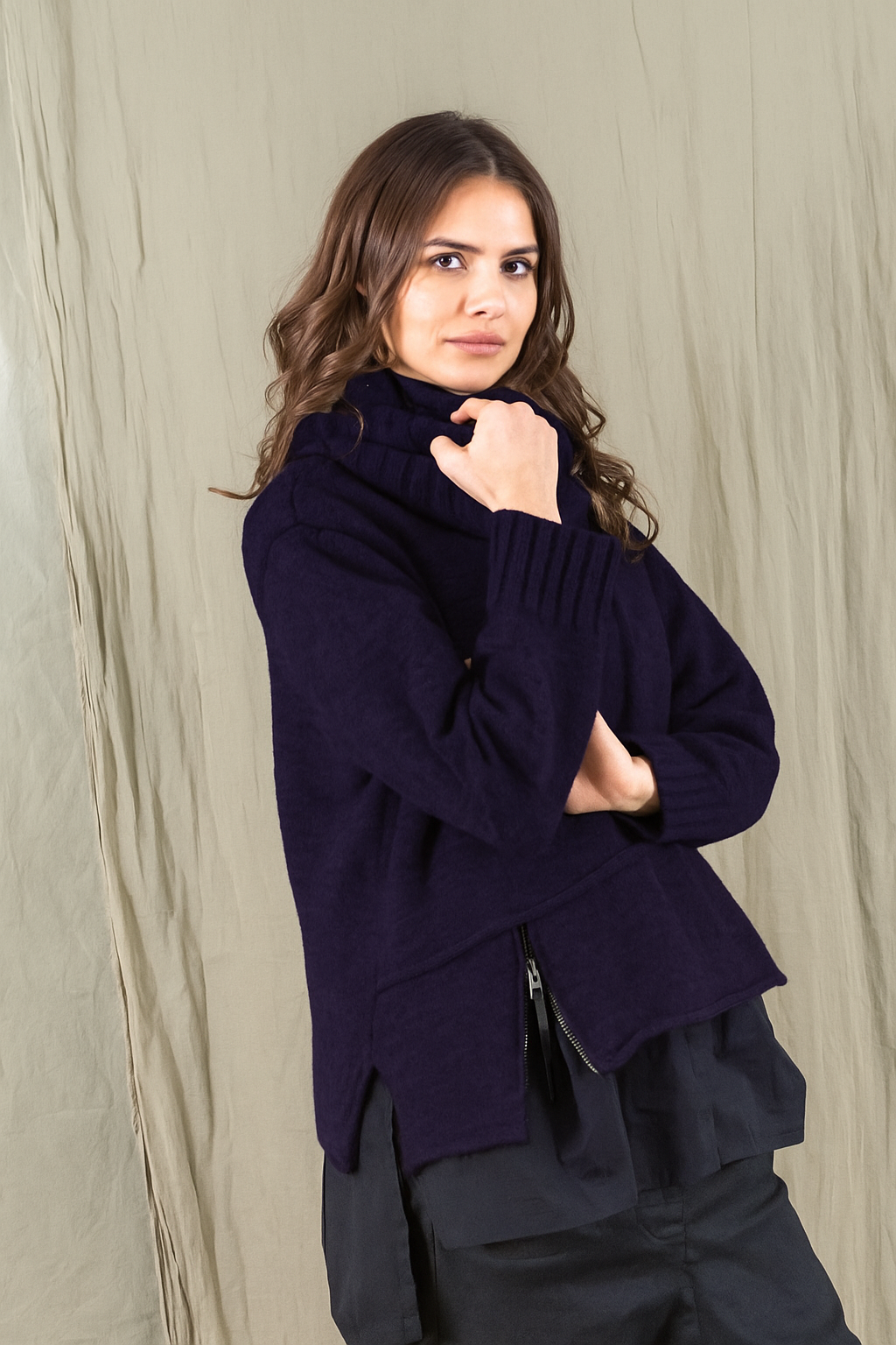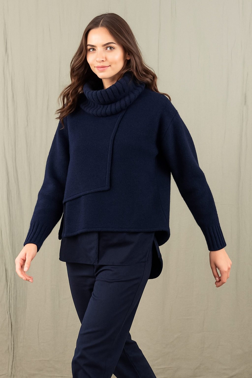 Gerade und kurz geschnitten, passt er zu weiten Hosen und Röcken. Im Layhering lässt er sich auch gut mit schmalen Hosen kombinieren. Ein Blickfang ist der halsferne und separate Rollkragen, den Sie auch gut als Schal verwenden können. Für einen guten Fall und eine schöne Silhouette sorgen die Teilungsnähte und der Reißverschluss im Vorderteil.