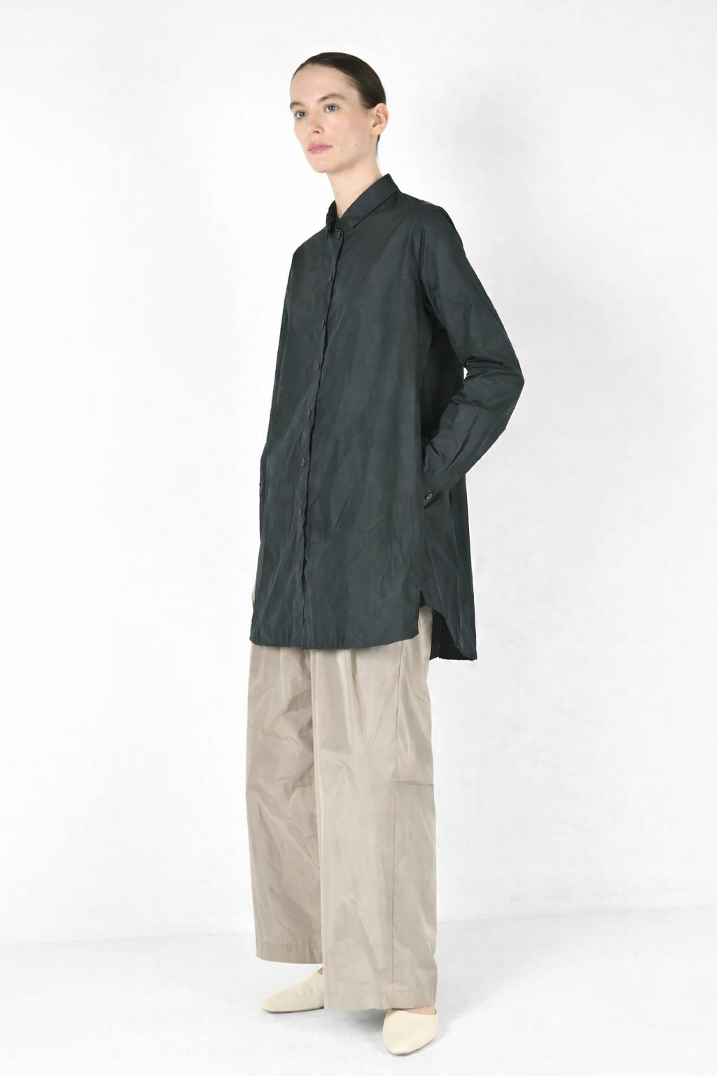 Puristisch, leicht und mit souveräner Weite. Diese Bluse aus feinem italienischem Mikrofaser-Taft vereint technische Leichtigkeit mit moderner Silhouette. Das Material wirkt seidig, ist federleicht auf der Haut und verleiht der Form ihre charakteristische, ruhige Spannung.