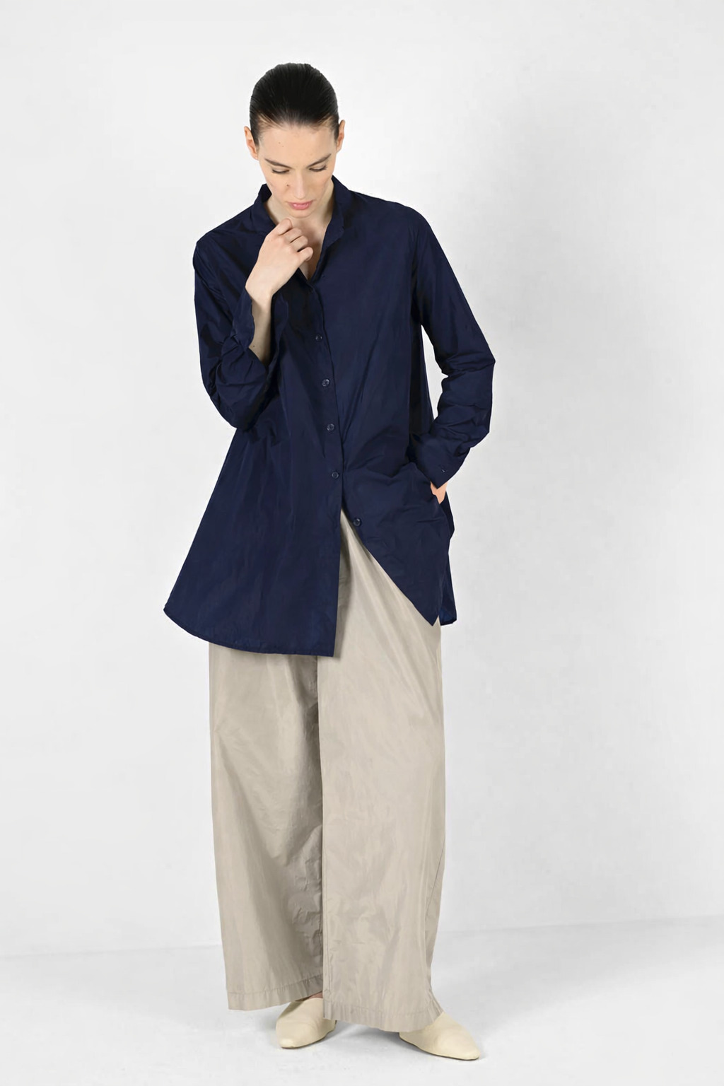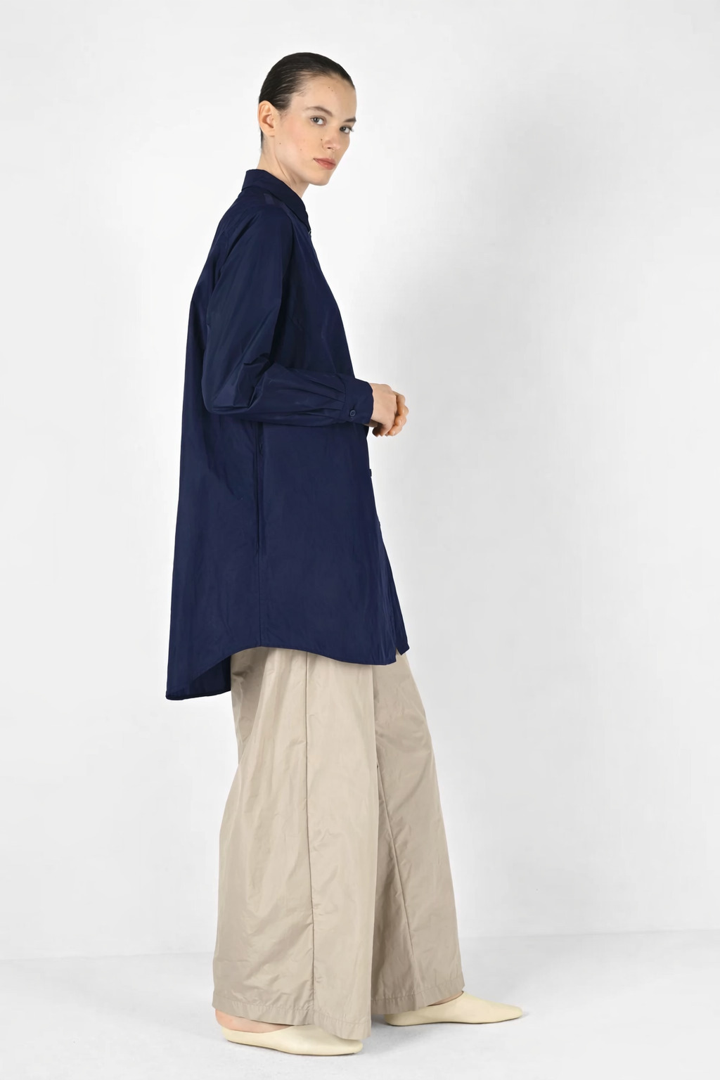 Puristisch, leicht und mit souveräner Weite. Diese Bluse aus feinem italienischem Mikrofaser-Taft vereint technische Leichtigkeit mit moderner Silhouette. Das Material wirkt seidig, ist federleicht auf der Haut und verleiht der Form ihre charakteristische, ruhige Spannung.