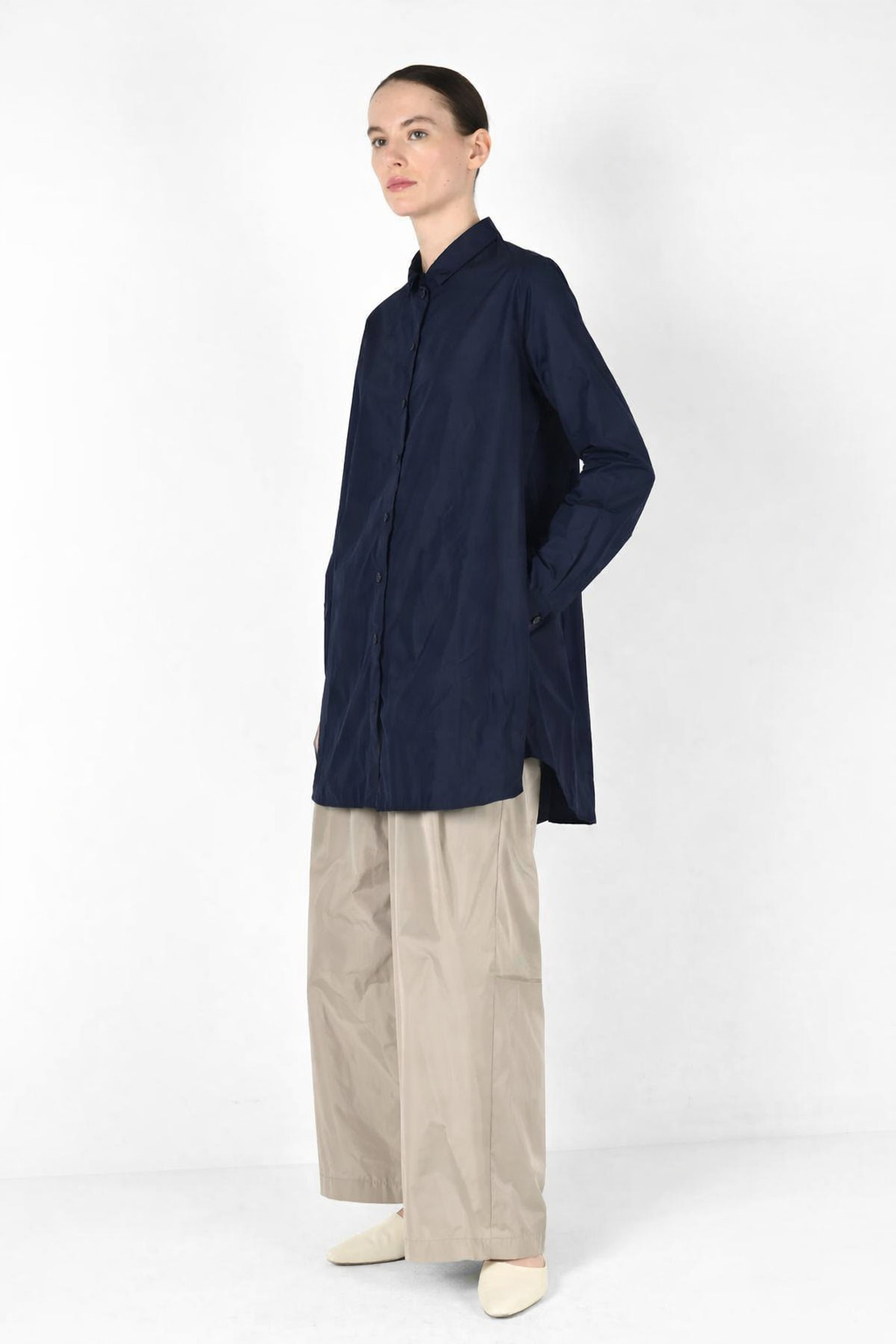 Die klare Linienführung mit verdeckter Knopfleiste, schmalem Kragen und sanft ausgestellter Länge sorgt für eine elegante, zeitlose Wirkung. Die leicht verlängerte Rückenpartie und die fließende Weite geben Bewegungsfreiheit und unterstreichen den minimalistischen Charakter.