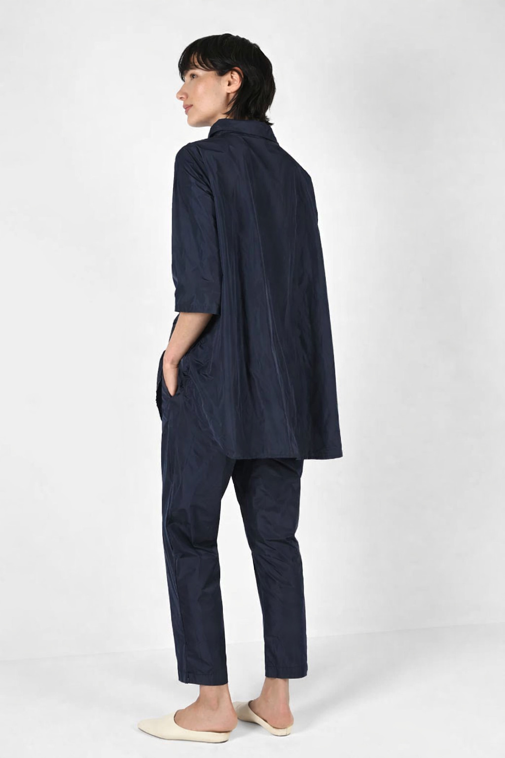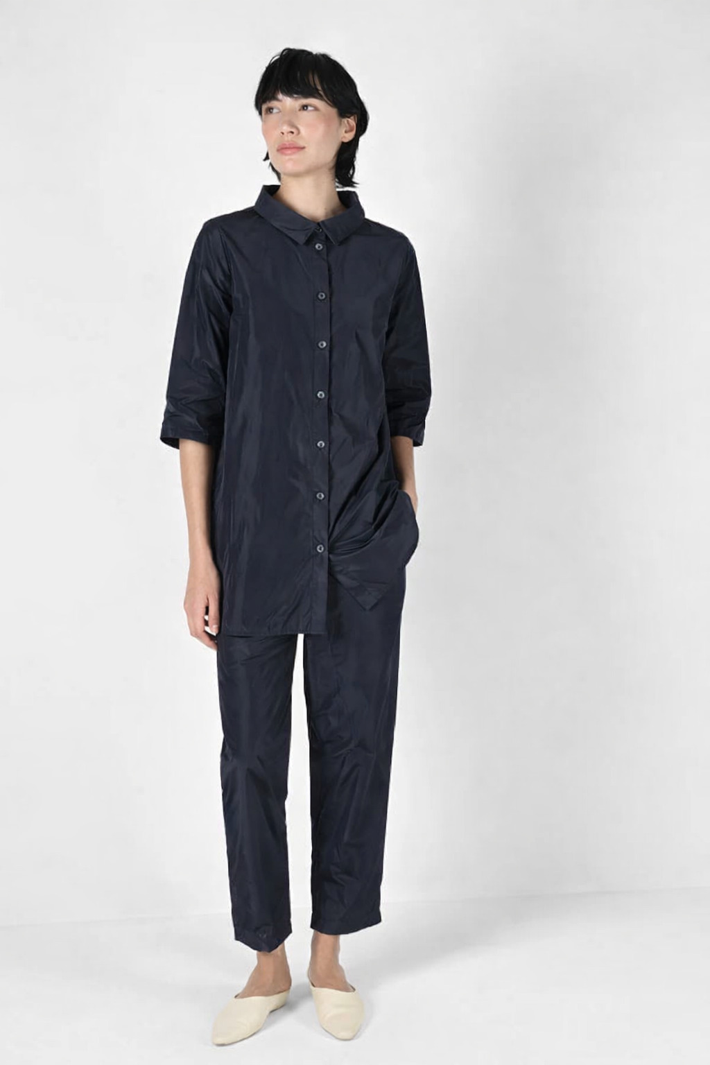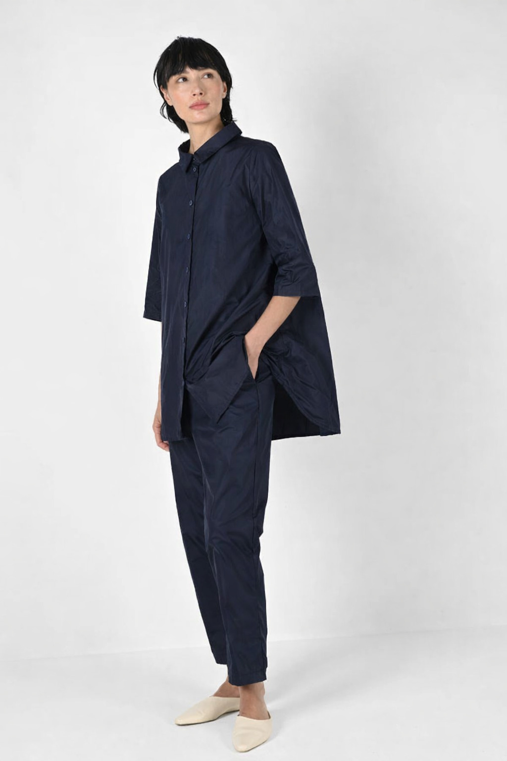Die klare Hemdblusenform mit schmalem Kragen und durchgehender Knopfleiste wirkt reduziert und zeitlos. Die sanft ausgestellte A-Form, vom Brustpunkt bis zum Saum und die verlängerte Linie im Rücken sorgen für eine fließende Bewegung und eine entspannte, moderne Silhouette. Seitliche Taschen unterstreichen den architektonischen Charakter und geben der Bluse ihre souveräne Lässigkeit.